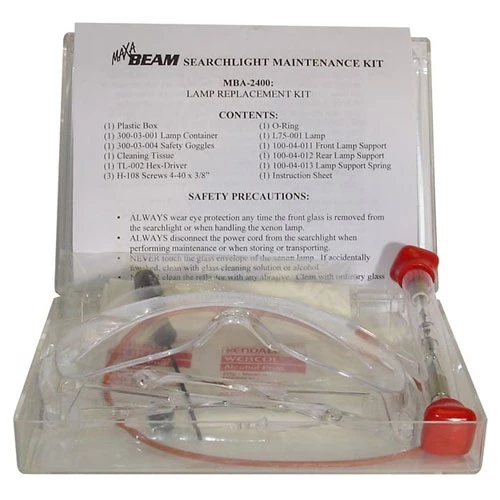 Maxa Beam Replacement Lamp Kit. Contains one 75 watt Xenon short-arc lamp along with step-by-step instructions, materials and tools required to safely replace the lamp assembly.