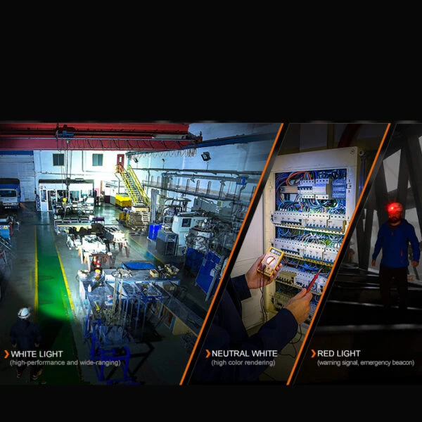• high output spotlight, neutral white floodlight plus low light red