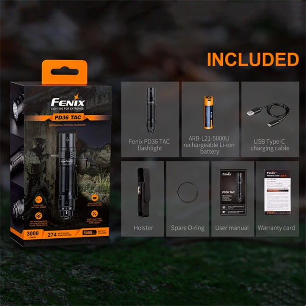 What’s included: Fenix PD36 TAC flashlight, rechargeable battery, USB-C cable, pocket clip, nylon belt holster, spare O-ring