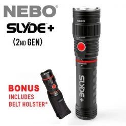 What’s included: NEBO SLYDE+ flashlight (2nd generation – 400 lumen model) with batteries; Note: nylon belt holster with open top is also included while quantities last