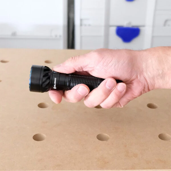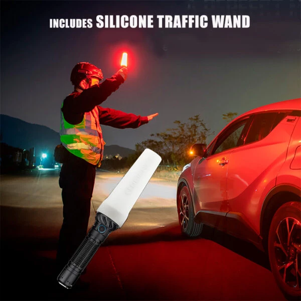 What’s included: Olight Freyr flashlight, rechargeable battery, pocket clip, magnetic charging cable, silicone traffic wand (stores in holster), nylon holster with magnetic closure (charging plug adapter available separately – see accessories below)